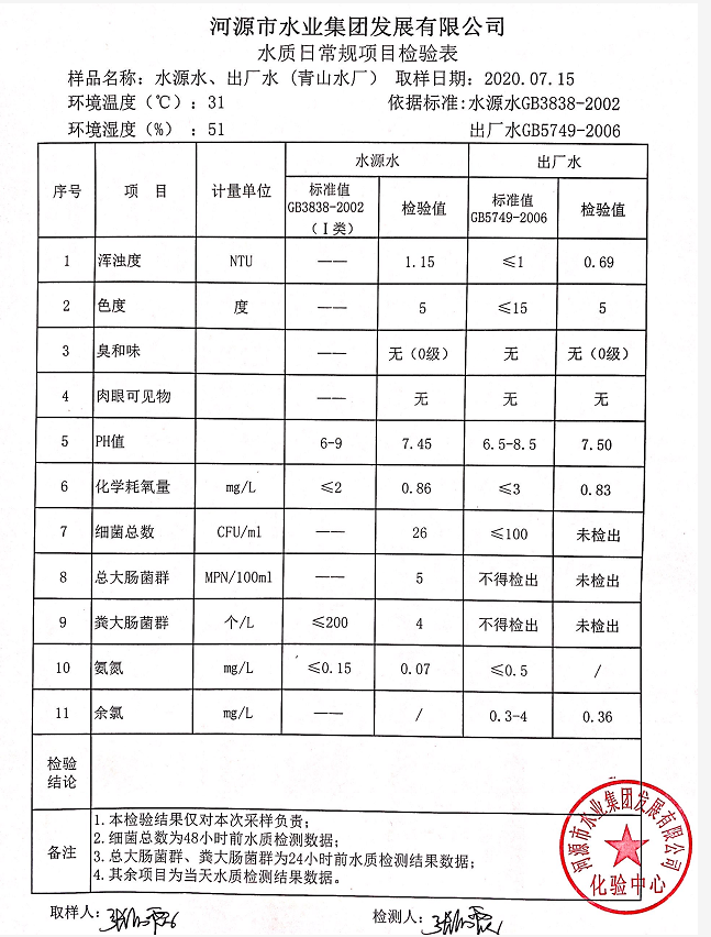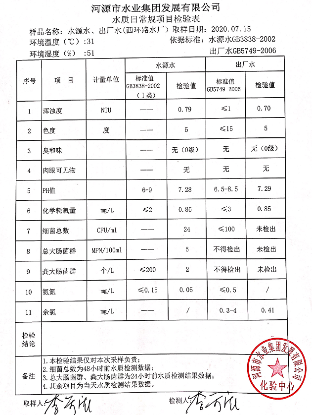 2020年7月15日水質檢驗報告