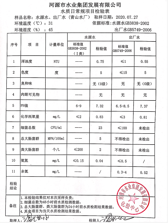 2020年7月27日水質(zhì)檢驗報告