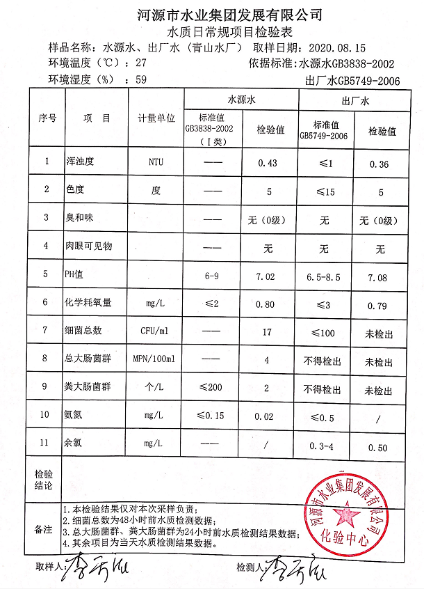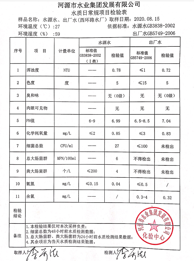 2020年8月15日水質檢驗報告