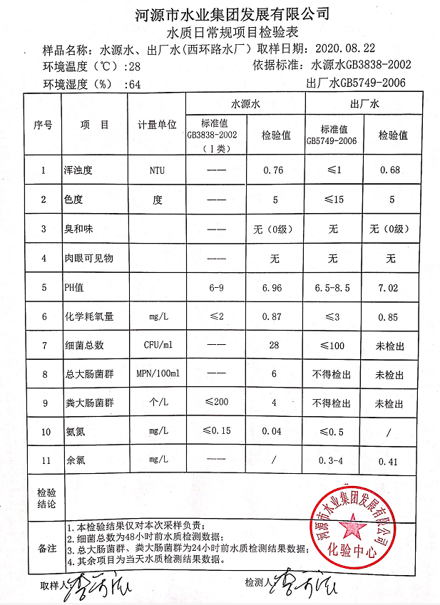2020年8月22日水質(zhì)檢驗(yàn)報告