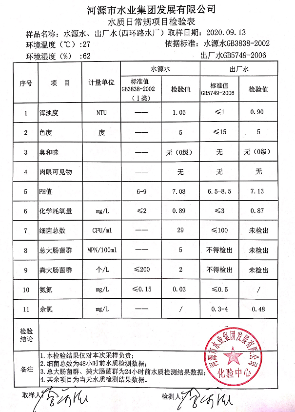 2020年9月13日水質(zhì)檢驗(yàn)報告
