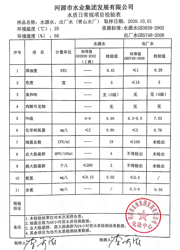 2020年10月1日水質(zhì)檢驗(yàn)報(bào)告