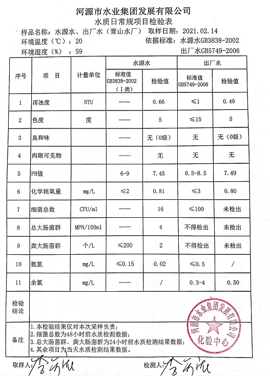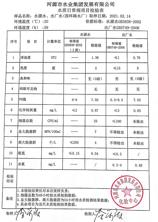 2021年2月14日水質(zhì)檢驗(yàn)報告