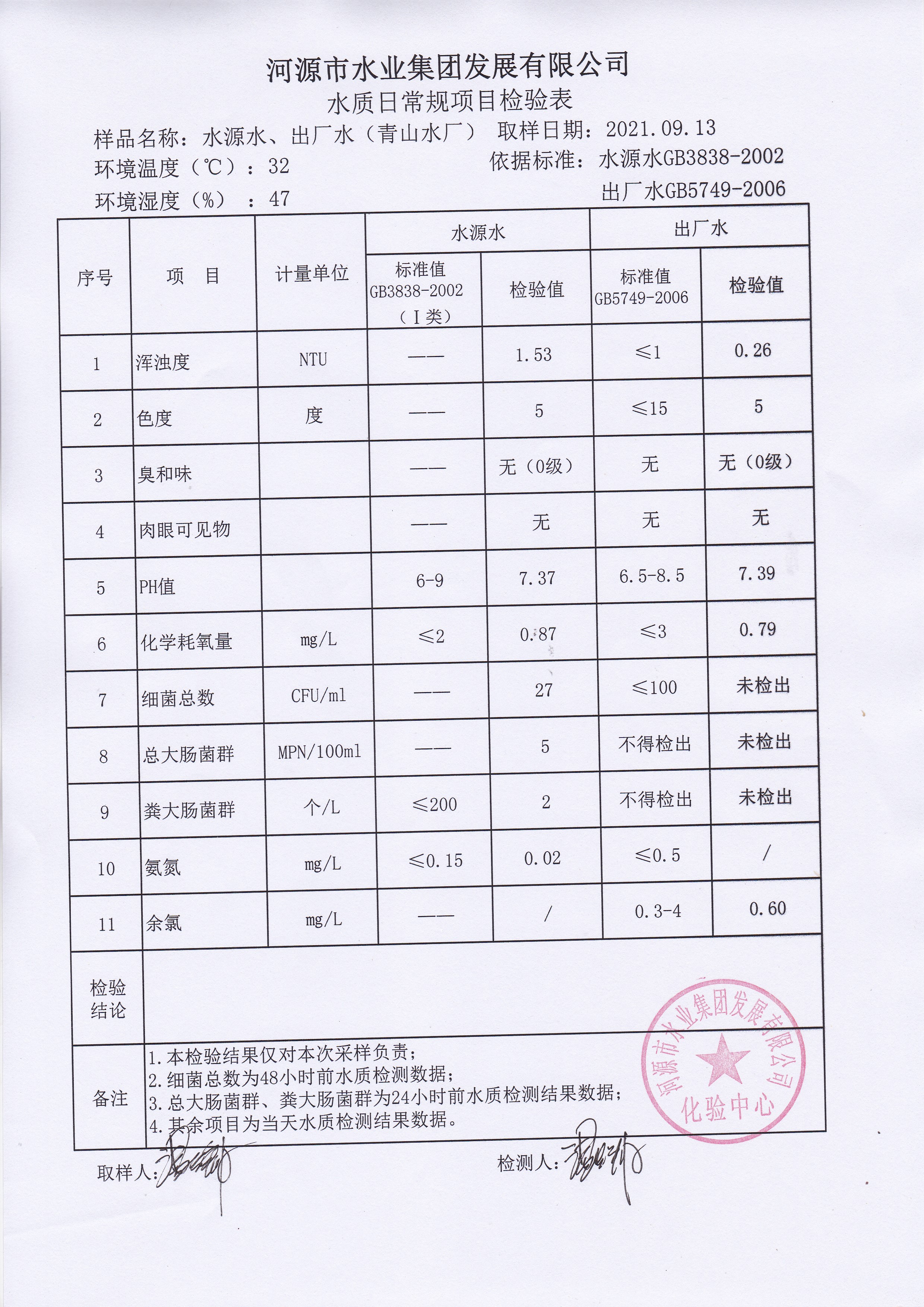 2021年9月13日水質(zhì)檢驗(yàn)報(bào)告 ??