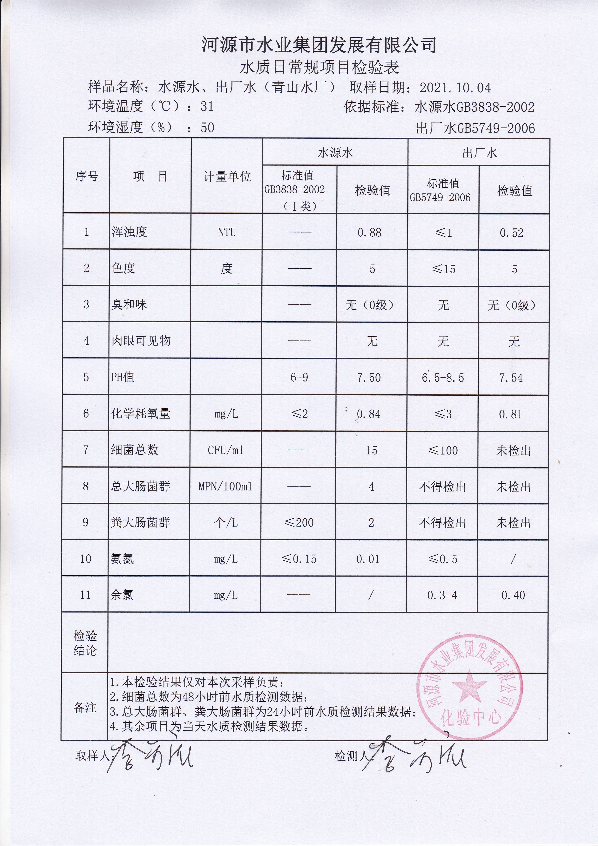 2021年10月4日水質(zhì)檢驗(yàn)報(bào)告