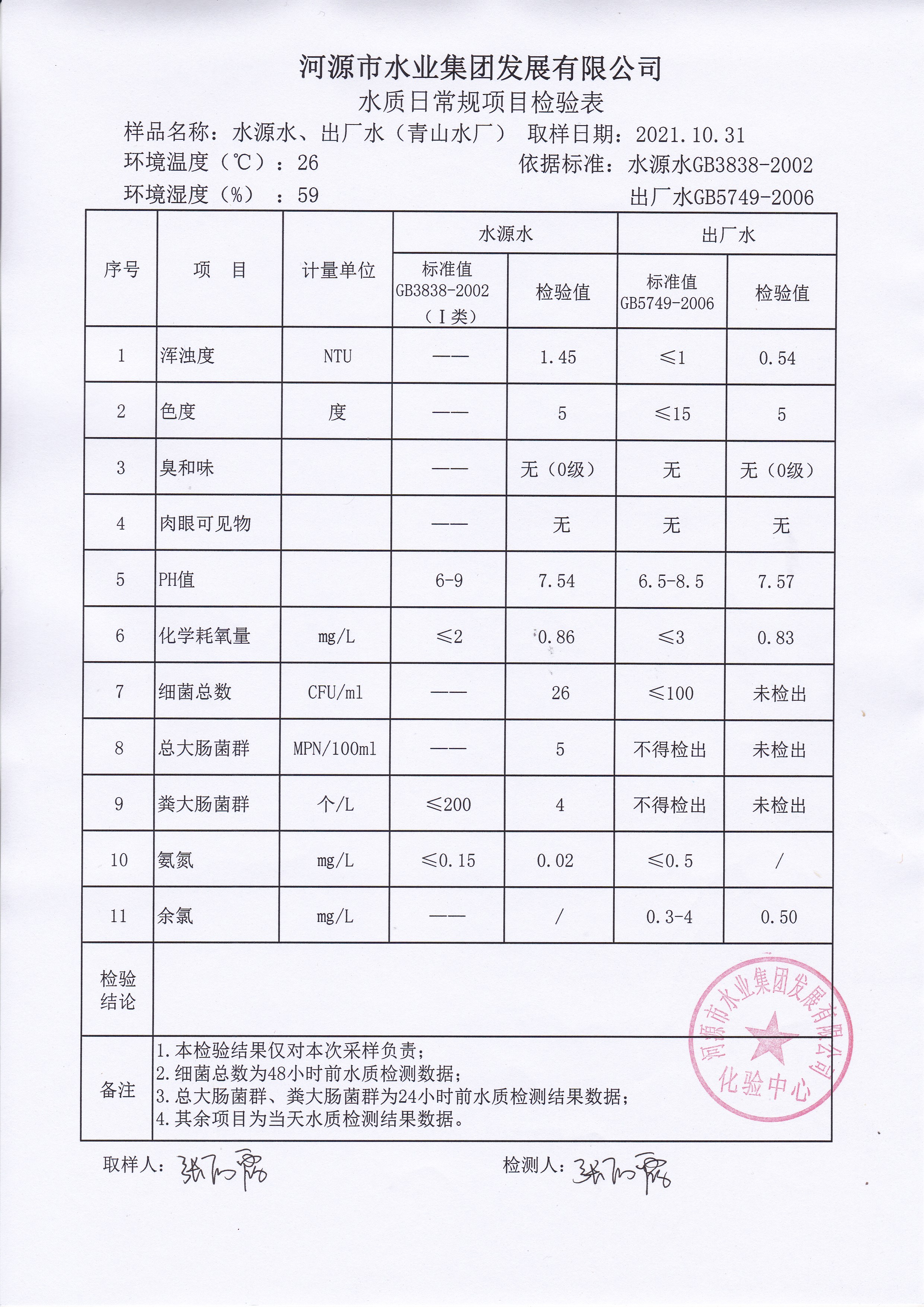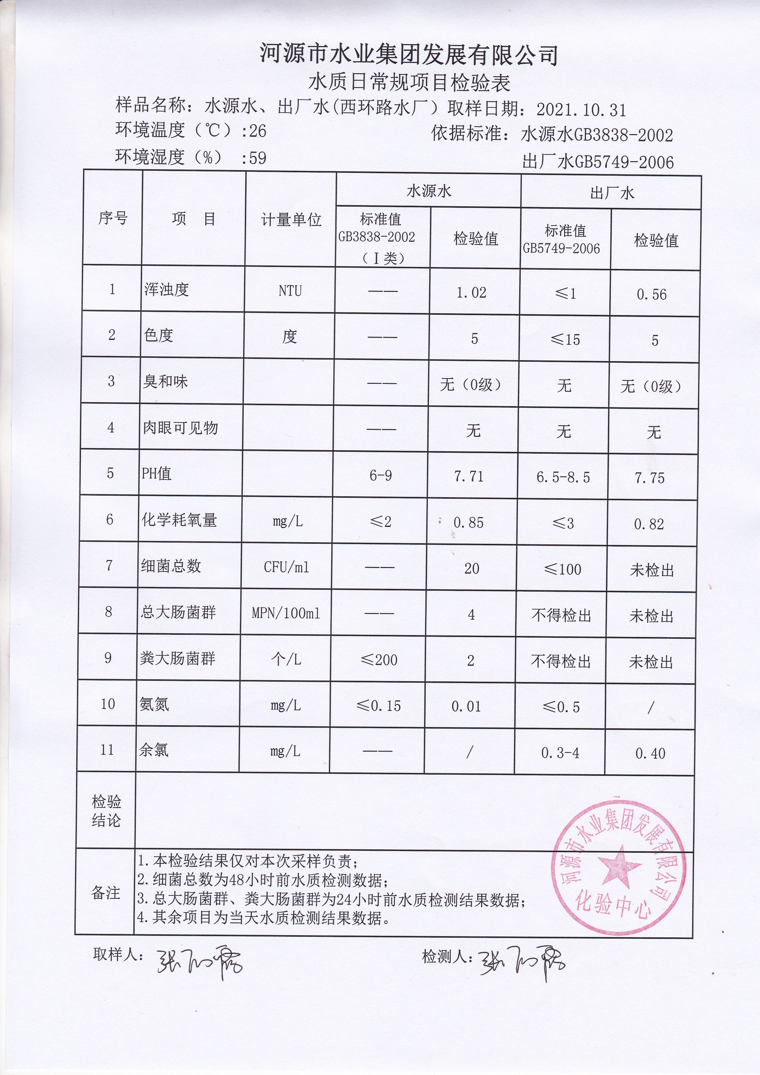 2021年10月31日水質(zhì)檢驗(yàn)報告