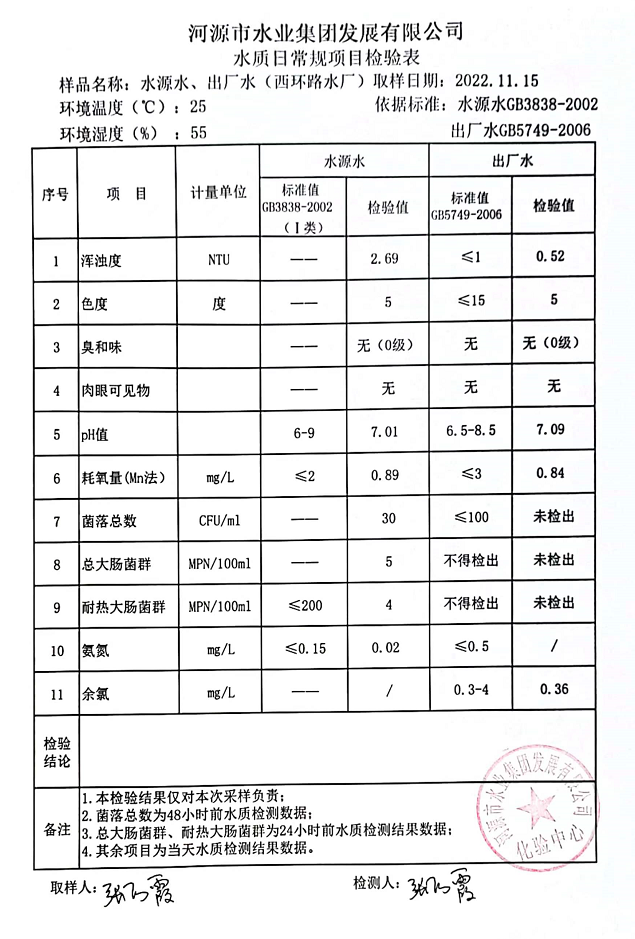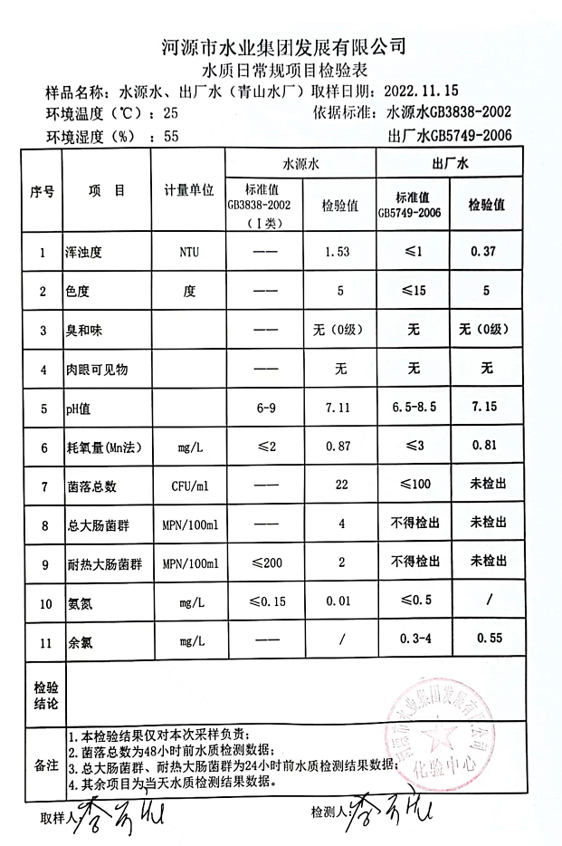 2022年11月15日水質(zhì)檢驗(yàn)報告