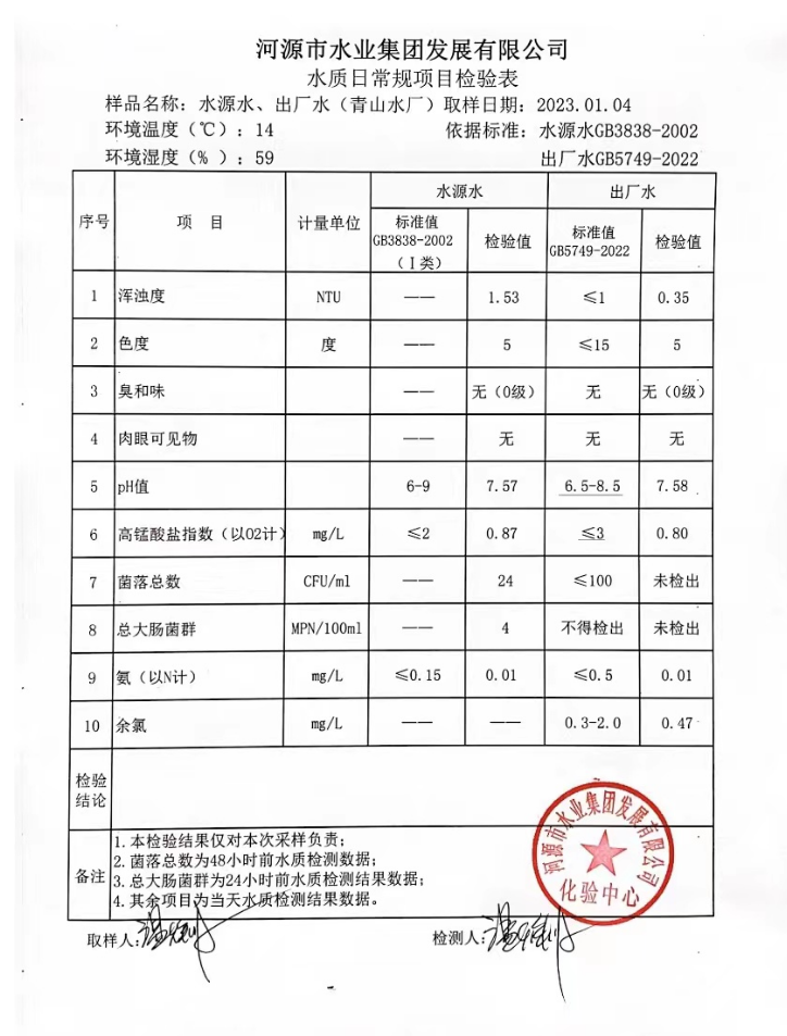 2023年1月4日水質(zhì)檢驗報告