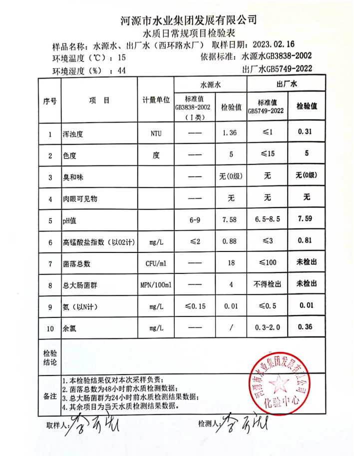 2023年2月16日水質(zhì)檢驗(yàn)報告