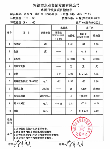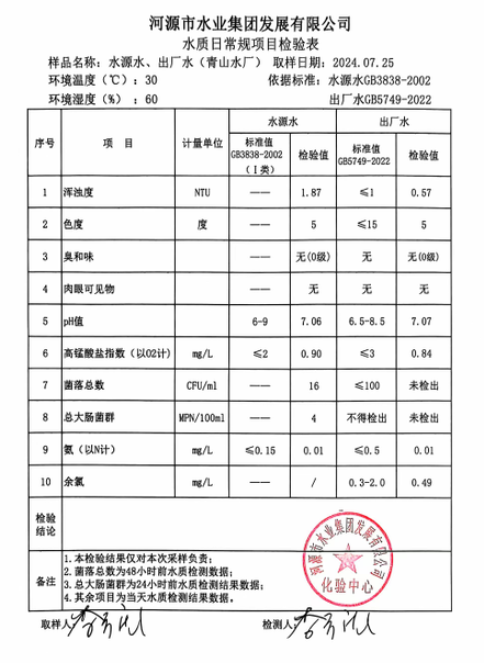 2024年7月25日水質(zhì)檢驗(yàn)報告