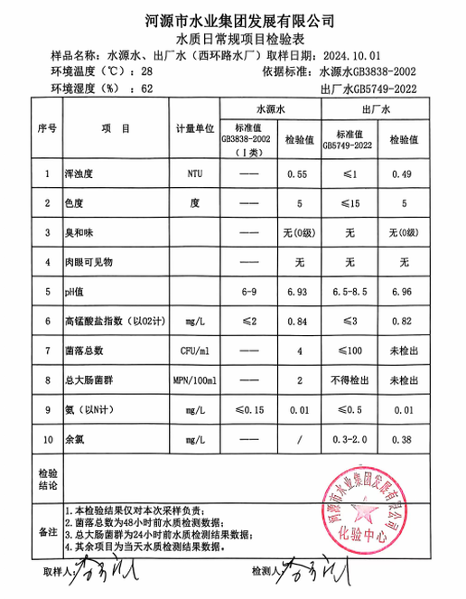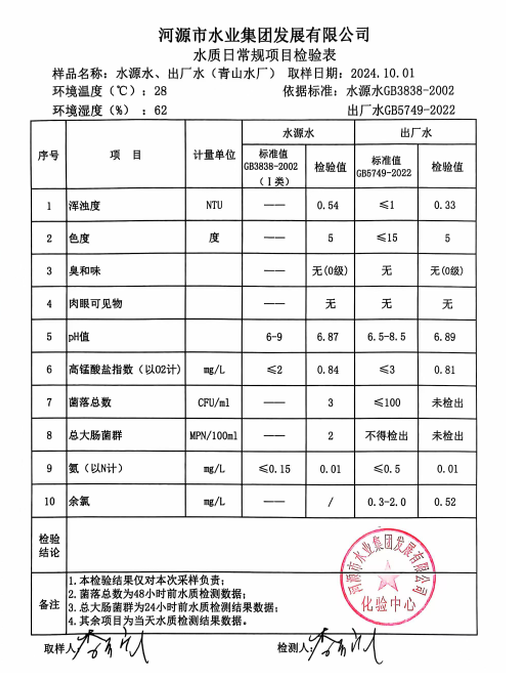 2024年10月1日水質(zhì)檢驗(yàn)報(bào)告
