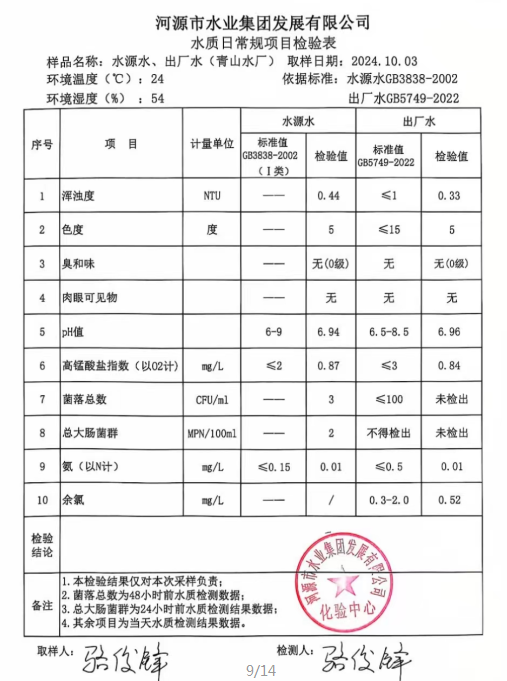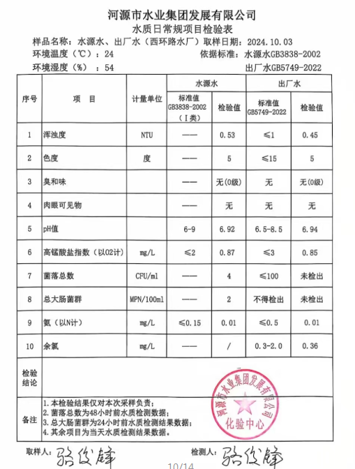 2024年10月3日水質(zhì)檢驗報告